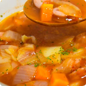 大きめの具がゴロゴロ入ったしっかり噛んで味わう満足スープです。